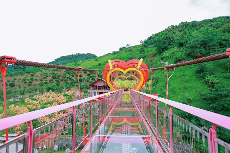 Entertainment space and experience Bridge of Love love: Test your courage on the first 5D glass bridge in Vietnam across the waterfall, where you can stand in mid-air to admire the magical beauty of nature right in Moc Chau ward.
