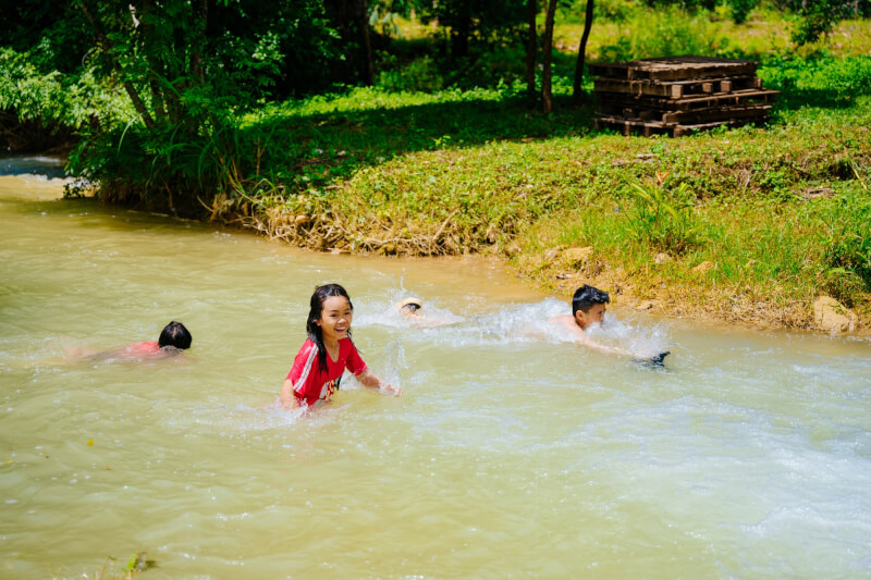 Suoi Vat is the upstream flow that provides water all year round for Dai Yem waterfall, winding softly through the rocks in Moc Chau ward. The stream has a peaceful beauty with clear blue water that can be seen through to the bottom, surrounded by vibrant tropical vegetation and ancient trees silhouetted against the lake surface. This is an ideal space for visitors to relax, listen to the sound of gurgling water and explore the rich coastal ecosystem, reminiscent of the pristine beauty of the S-shaped land before immersing yourself in the majestic stream downstream.