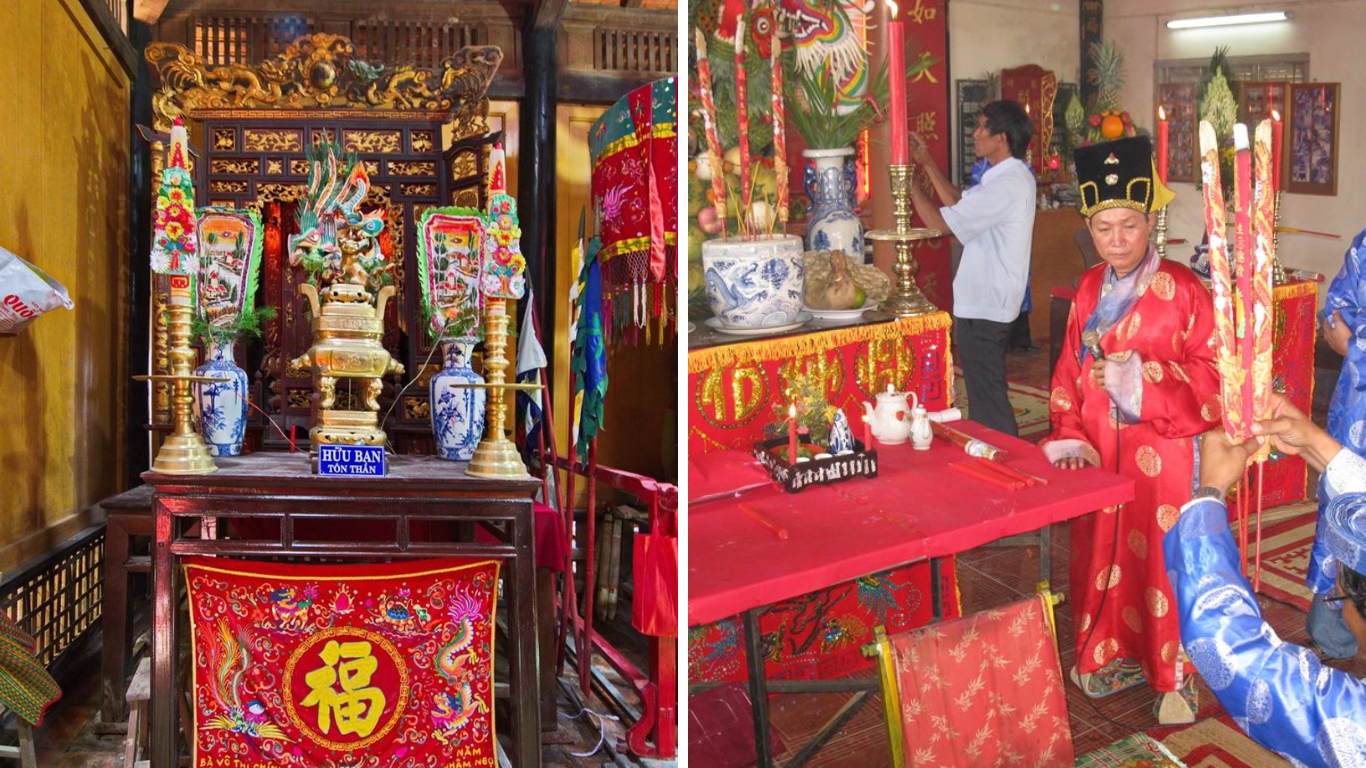 Bên trong chính điện, bàn thờ Thành Hoàng được đặt ở vị trí trung tâm, xung quanh là các bài vị thờ Hùng Vương, Bạch Mã Thái Giám và các vị Tiền Hiền, Hậu Hiền. Mỗi chi tiết trang trí đều mang ý nghĩa tâm linh sâu sắc, thể hiện lòng tôn kính của người dân đối với tổ tiên. Trên các bao lam, hoành phi và câu đối đều được sơn son thếp vàng rực rỡ, tạo nên vẻ đẹp trang trọng. Khi ánh sáng buổi sáng chiếu vào, toàn bộ không gian như được khoác lên lớp ánh vàng huyền ảo, rất khó quên.