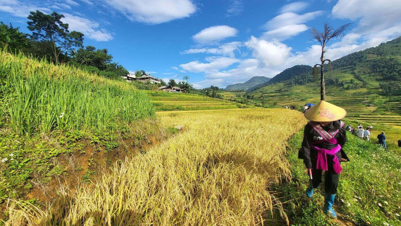 秋は北西部では稲の花が咲き始める時期でもあります。実りの稲穂の棚田は、この土地をしなやかで優しい黄色の衣装を着ているかのように見せます。緑だった稲が徐々に黄色く輝き、山腹や丘陵の斜面に忍び寄る様子は、まるで印象的な芸術作品のように荘厳で魅惑的な美しさを放ちます。