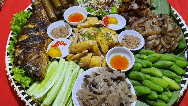 Ăn uống tại Bản Lác: Thưởng thức cơm lam, gà đồi, lợn mường và rượu cần ngay tại nhà sàn truyền thống.