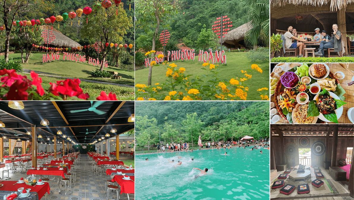 Khuôn viên của khu du lịch sinh thái hang Phượng Hoàng - suối mỏ Gà với diện tích hơn 1,6 hecta có đầy đủ các hạng mục như: Nhà hàng,khách sạn,quầy cà phê,bể bơi cho mọi lứa tuổi,khu vui chơi trải nghiệm,nhà sàn cộng đồng,khu lưu trú,hệ thống tiểu cảnh,vườn hoa trồng rất nhiều loài hoa với muôn sắc tỏa hương,được phân thành các khu vực,thỏa sức cho du khách “sống ảo”,cùng với tiếng suối chảy róc rách,tiếng chim thánh thót như những bản nhạc rừng độc đáo và đầy mê hoặc lôi cuốn du khách khám phá những điều kỳ bí ẩn giấu trong những hang động nơi đây.