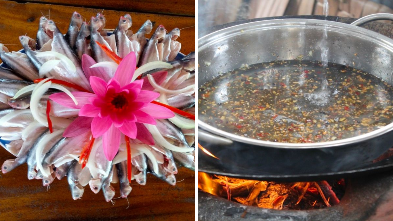 Thay vì dùng cá tươi sống nhúng lẩu, cá lăng được sơ chế kỹ lưỡng rồi "hơ" qua lửa. Kỹ thuật này giúp bề mặt thịt cá săn lại, giữ được nước ngọt bên trong. Đồng thời, việc "hơ" lửa còn giúp miếng cá dậy lên mùi thơm hấp dẫn. Khi nhúng vào nước giấm nóng, thịt cá chín tới mà không bị bở nát.