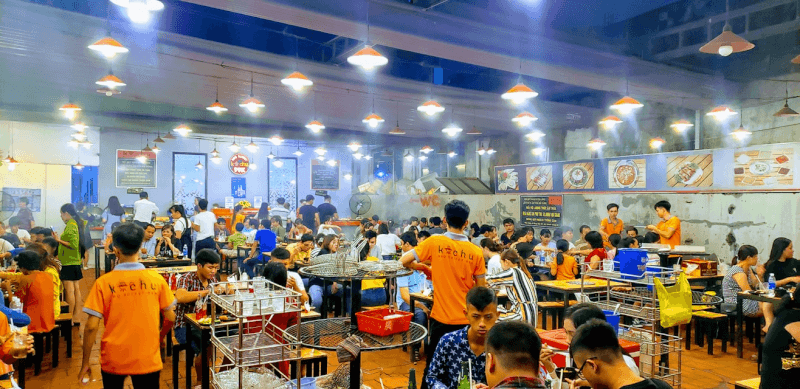 Kachu Buffet Nướng chọn phong cách thiết kế không gian rất đơn giản, không quá chú trọng vào các chi tiết trang trí cầu kỳ hay màu mè. Tuy nhiên, sự giản dị này lại mang đến hiệu quả bất ngờ khi tạo ra một không gian mở vô cùng thoáng đãng và dễ chịu cho thực khách. Quán còn được trang bị mái che di động tiện lợi, giúp bạn thoải mái nướng đồ ăn mà không lo bị ám mùi khói hay cảm thấy ngột ngạt, ngay cả khi quán đông khách.