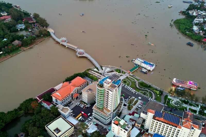 Thiết kế hình chữ S uốn lượn mềm mại trên sóng nước giúp công trình này trở thành điểm kết nối lý tưởng giữa bến tàu chính và vùng cồn xanh mướt phía xa. Hai đài sen khổng lồ rực rỡ sắc màu nhờ hệ thống đèn LED nghệ thuật hiện đại luôn mang đến vẻ đẹp lung linh huyền ảo cho toàn bộ khu vực khi đêm về. Đứng từ đây, bạn có thể dễ dàng phóng tầm mắt chiêm ngưỡng toàn cảnh cầu Cần Thơ hùng vĩ và tận hưởng những làn gió mát rượi thổi vào từ phía hạ lưu sông Mekong.