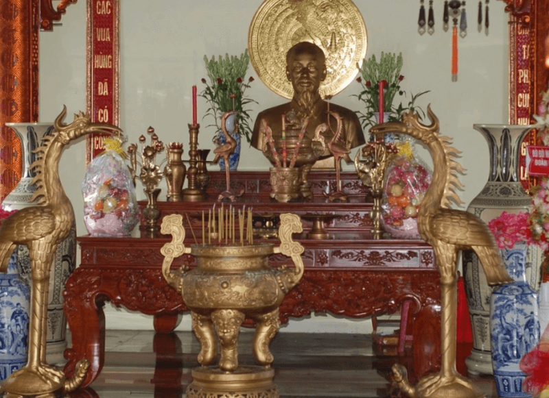 Ngôi Đền thờ chính nằm ở trung tâm của di tích, được xây dựng theo lối kiến trúc truyền thống với mái ngói đỏ tươi và hệ thống cột gỗ trang nghiêm. Bên trong chính điện, tượng Bác Hồ được đặt tại vị trí trang trọng nhất trên bục cao, xung quanh là các hoành phi, câu đối ca ngợi công đức của Người. Không gian tại đây luôn phảng phất mùi hương trầm ấm cúng, tạo nên một bầu không khí tĩnh mịch, thành kính, giúp du khách cảm thấy thư thái và tự hào khi nghiêng mình trước anh linh của Bác.