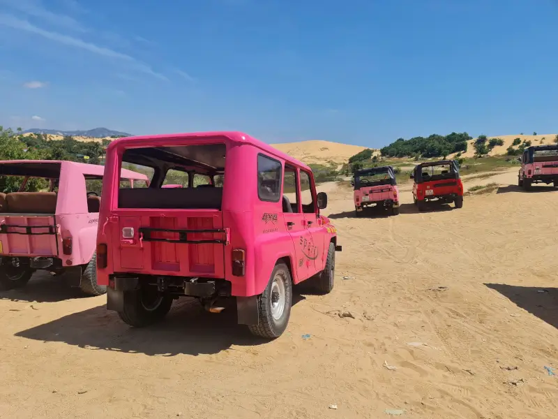Do đặc thù địa hình cát lún và nhiều dốc cao nên xe Jeep hoặc xe UTV là phương tiện di chuyển chính tại đây. Những chiếc xe này được điều khiển bởi những người dân địa phương thông thạo đường xá của xã Phước Dinh để đảm bảo an toàn. Trải nghiệm băng qua những triền cát gập ghềnh mang lại cảm giác phấn khích và tầm nhìn bao quát đại dương từ trên cao. Bạn có thể thuê xe ngay tại các trạm dừng chân ven đường DT701 với mức giá niêm yết rõ ràng theo số lượng người.