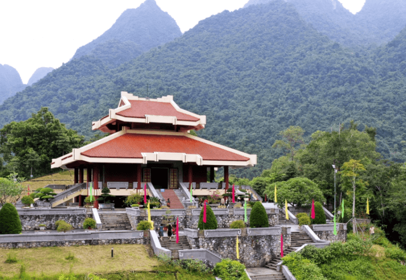 Tọa lạc trên đỉnh đồi Tiên cao ráo và thoáng đãng, đền thờ Chủ tịch Hồ Chí Minh là công trình kiến trúc mang đậm nét văn hóa truyền thống của đồng bào các dân tộc tỉnh Cao Bằng. Ngôi đền được xây dựng theo kiểu nhà sàn cách điệu, sử dụng vật liệu gỗ và đá tự nhiên, tạo nên vẻ hài hòa tuyệt đối với cảnh quan rừng núi xung quanh. Từ khoảng sân rộng phía trước đền, bạn có thể phóng tầm mắt bao quát toàn bộ thung lũng Pác Bó xanh thẳm, cảm nhận sự giao thoa giữa lòng dân và ý Đảng trong một không gian trang nghiêm nhưng vô cùng ấm áp.