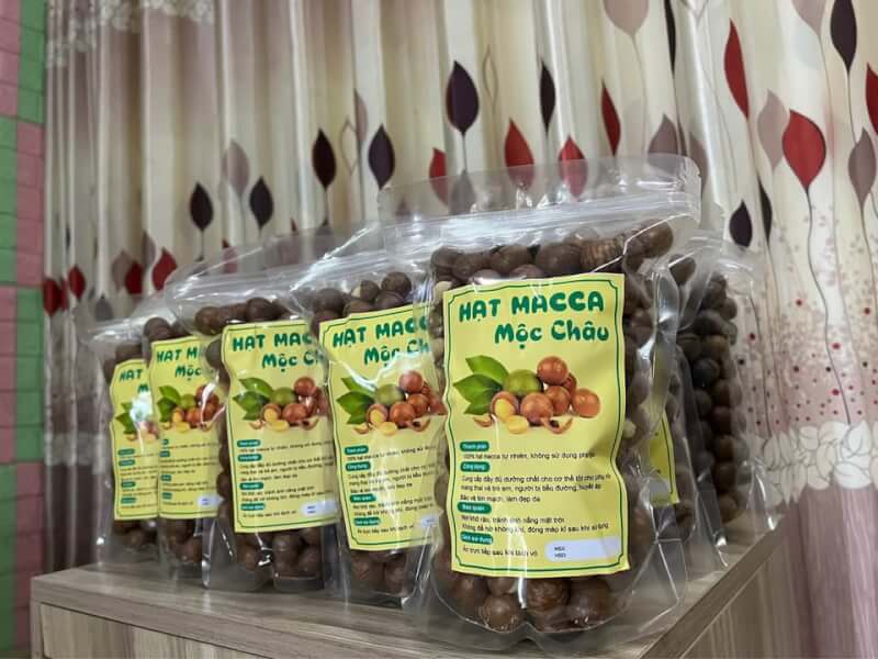 Hạt Mắc ca Mộc Châu: Sản phẩm cao cấp được trồng và chế biến tại phường Thảo Nguyên. Hạt có vị béo ngậy, bùi thơm, giàu dinh dưỡng và được đóng gói hút chân không kèm dụng cụ tách vỏ tiện lợi. Giá khoảng 250.000 – 450.000 VNĐ/kg.