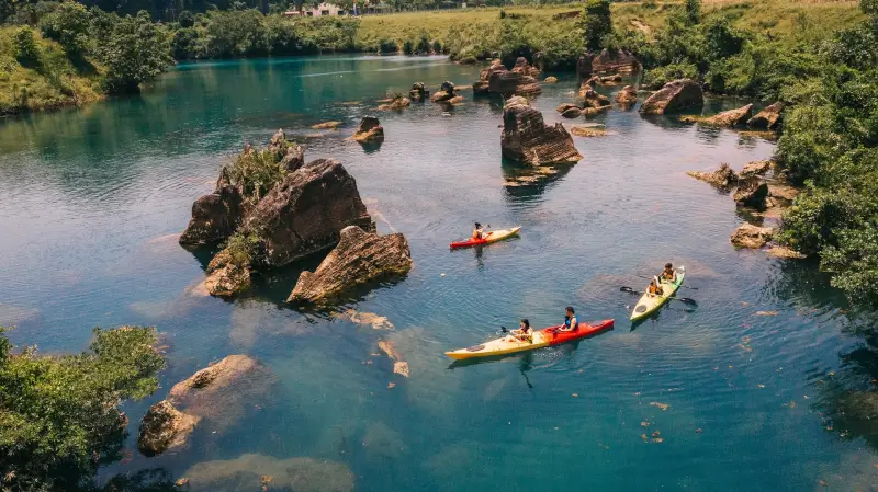 Dòng sông Quây Sơn xanh ngắt chảy hiền hòa qua các bản làng của xã Đàm Thủy chính là khởi nguồn của vẻ đẹp Thác Bản Giốc kỳ vĩ. Trải nghiệm ngồi trên những chiếc thuyền mảng tre hoặc chèo thuyền SUP lướt đi trên mặt nước trong vắt để tiếp cận gần sát chân thác là hoạt động được yêu thích nhất của mọi du khách. Tại đây, bạn sẽ được tận mắt chiêm ngưỡng những khối núi đá vôi nhấp nhô soi bóng xuống dòng nước và cảm nhận những tia nước mát lạnh bắn vào mặt, mang lại sự sảng khoái và phấn khích tuyệt đối giữa không gian bao la của biên thùy.