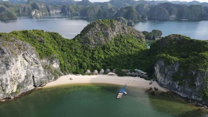 Monkey Island Resort tọa lạc biệt lập trên bãi tắm Cát Dứa 2, mang đến không gian nghỉ dưỡng thực thụ giữa lòng vịnh Lan Hạ với các căn bungalow bằng gỗ và mái lá nằm ẩn mình dưới tán cây xanh mướt hướng mặt ra biển. Du khách nghỉ tại đây sẽ được tách biệt hoàn toàn với tiếng ồn phố thị, thoải mái tham gia các hoạt động chèo thuyền Kayak, lửa trại bãi biển và tận hưởng cảm giác bình yên tuyệt đối khi đêm xuống giữa đại dương. Với mức giá từ 1.800.000 – 3.500.000 VNĐ/đêm bao gồm cả dịch vụ tàu đón tiễn từ bến Bèo, resort là điểm dừng chân lý tưởng cho những ai muốn hòa mình trọn vẹn vào thiên nhiên hoang sơ.