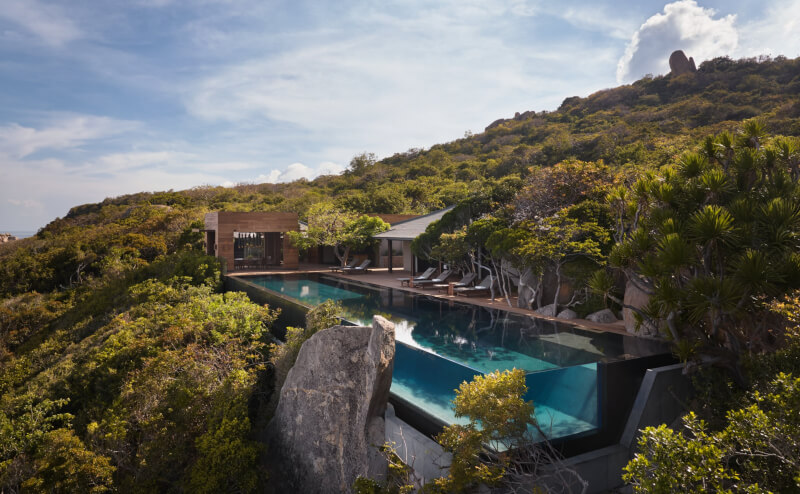 Amanoi Resort là khu nghỉ dưỡng siêu sang nằm trực tiếp trong vùng lõi của Vườn quốc gia Núi Chúa. Về khoảng cách, resort này cách Vịnh Vĩnh Hy chỉ 2 km và cách Hang Rái khoảng 5 km, cực kỳ thuận tiện cho việc tham quan các tọa độ chính. Các biệt thự tại đây ẩn mình giữa rừng cây vách đá, mang lại không gian riêng tư tuyệt đối cho những ai muốn hòa mình vào thiên nhiên một cách xa hoa nhất. Giá phòng tại đây thuộc phân khúc cao cấp nhất, thường từ 30.000.000 – 100.000.000 VNĐ/đêm.