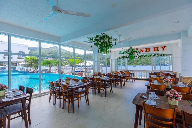 Tọa lạc ngay bên bờ vịnh thuộc xã Vĩnh Hải, nhà hàng Vĩnh Hy Resort sở hữu không gian mở khoáng đạt với tầm nhìn bao quát toàn cảnh tàu thuyền neo đậu trên mặt nước xanh biếc. Nhà hàng chuyên phục vụ các món hải sản tươi sống được tuyển chọn kỹ lưỡng từ các bè nuôi địa phương, chế biến theo hương vị đậm đà của vùng biển Ninh Thuận. Thực khách có thể thưởng thức bữa tối trong không gian lộng gió, lắng nghe tiếng sóng và cảm nhận hơi thở của núi rừng Núi Chúa ngay sát bên mình. Giá trung bình tại đây dao động từ 250.000 – 550.000 VNĐ/người.