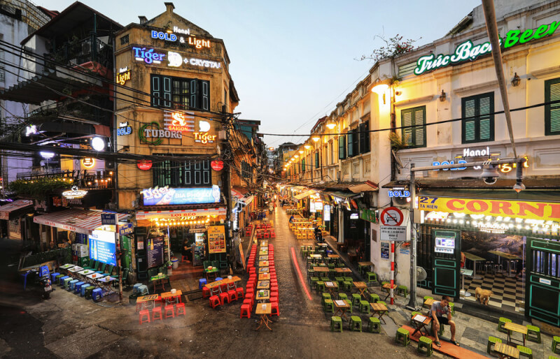 Phố Tạ Hiện – con phố được mệnh danh là “ngã tư quốc tế” giữa lòng phố cổ – là nơi sôi động nhất Hà Nội về đêm. Dọc hai bên đường là hàng loạt quán bia, đồ ăn vặt và các món nướng thơm lừng. Du khách có thể ngồi trên những chiếc ghế nhựa nhỏ, nhâm nhi cốc bia hơi mát lạnh với giá chỉ 5.000 – 10.000 đồng, cùng trò chuyện trong không gian náo nhiệt.
