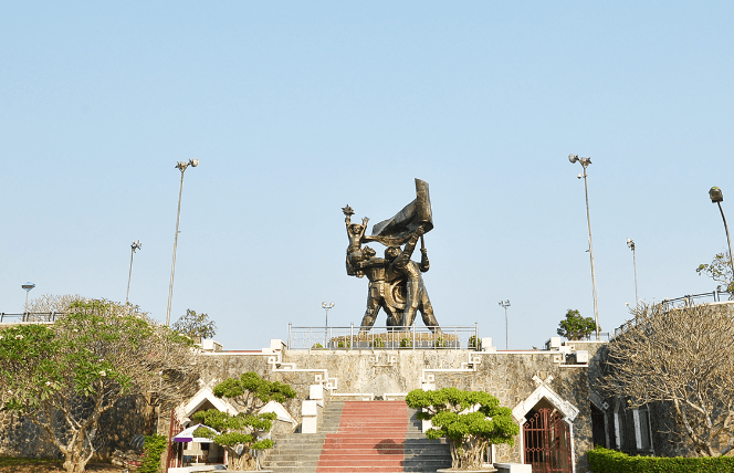 Lối lên tượng đài với 56 cột đá tượng trưng cho 56 ngày đêm chiến đấu.