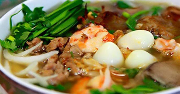 The bowl of rice noodle soup is hot,smelling of meat,shrimp,liver,small intestines of pork and fresh chive leaves. When served with fresh vegetables such as edible lettuce and herbs,it enhances the unique flavor of Sa Dec rice noodle soup,making diners even more delicious.