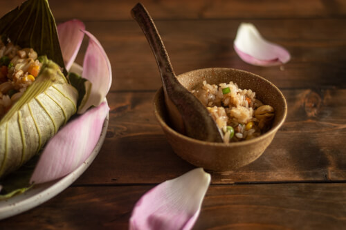 Món đầu tiên tôi được thưởng thức là cơm hấp lá sen. Khi mở lớp lá ra,hơi nóng nhẹ bốc lên cùng mùi thơm đặc trưng của sen làm tôi thấy bụng cồn cào. Bên trong là phần cơm trắng dẻo,trộn cùng hạt sen,nấm mèo thái sợi,cà rốt xắt nhuyễn,thịt xào và một ít tôm khô. Từng muỗng cơm mang theo vị béo bùi,ngọt nhẹ,thơm mát của lá sen thấm vào từng hạt gạo. Tôi ăn một cách chậm rãi,vừa ăn vừa nghe chị chủ quán kể chuyện về cách trồng sen,thu hoạch và giữ gìn nghề làm ẩm thực từ sen của người Đồng Tháp.