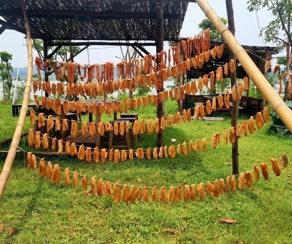 Bạn đã bao giờ thưởng thức cá một nắng chuẩn vị Làng Mô chưa? Cá lóc và cá rô phi tươi ngon từ lòng hồ được các đầu bếp lọc xương,ướp gia vị rồi phơi khô dưới nắng gió hồ Đồng Mô. Khi đã thấm đủ tinh hoa đất trời,cá khô lại được đem chiên hoặc nướng than hoa,tạo nên vị quê đặc trưng của ẩm thực cổ truyền.