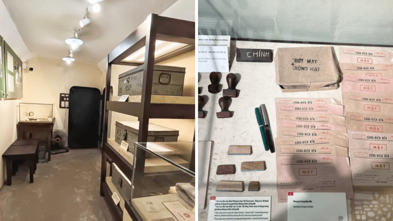 Khi bước vào bên trong, bạn sẽ bắt gặp hàng loạt hiện vật gắn liền với công tác mã dịch và điện mật thời bấy giờ. Những vật dụng như máy chữ, bút máy chuyên dụng hay các loại con dấu "tối mật" đều được bảo tồn vô cùng cẩn thận để phục vụ khách tham quan. Bạn có thể dễ dàng hình dung ra sự tỉ mỉ cùng tinh thần tập trung cao độ của các chiến sĩ cơ yếu khi làm việc dưới áp lực bom đạn.