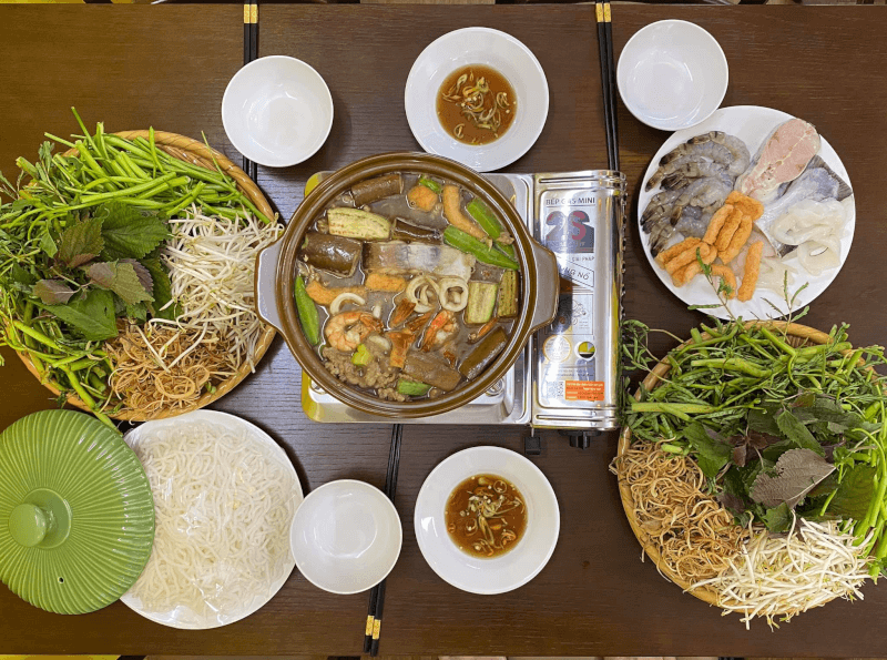 Đi kèm với nồi lẩu là đĩa rau đầy đặn với đủ loại từ bông súng, rau đắng đến kèo nèo hay rau muống. Từng thớ cá, mực và tôm tươi rói khi nhúng vào nước dùng sôi sùng sục tạo nên một bữa tiệc vị giác đầy màu sắc. Sự kết hợp giữa hải sản tươi sống và các loại rau sông nước giúp món ăn trở nên cân bằng, giúp bạn ăn ngon miệng mà không hề có cảm giác bị ngấy.