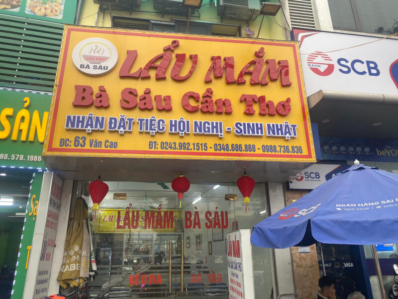 Lẩu Mắm Bà Sáu tại số 63 Văn Cao từ lâu đã trở thành điểm đến quen thuộc của những người yêu thích ẩm thực Nam Bộ. Nước lẩu ở đây có độ đậm đà vừa phải, dậy mùi mắm cá linh, cá sặc đặc trưng nhưng đã được gia giảm tinh tế để phù hợp với khẩu vị người Bắc. Bạn sẽ cảm nhận được vị ngọt thanh từ xương hầm hòa quyện cùng hương thơm nồng nàn lan tỏa ngay khi nồi lẩu vừa được bưng ra.