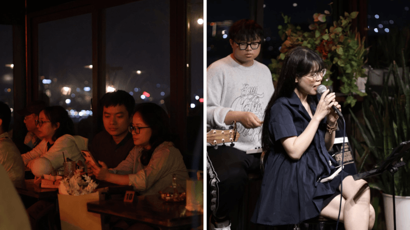 Điểm đặc biệt là bạn hoàn toàn có thể gửi gắm tâm tư thông qua những bài hát yêu cầu để dành tặng cho người thương hoặc bạn bè ngay tại sân khấu nhỏ của quán. Cảm giác được nghe bản nhạc mình yêu thích giữa không gian bao la trên cao thực sự là một trải nghiệm khó quên.