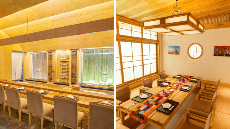 Kappo Sue gây ấn tượng mạnh với mình bởi phong cách thiết kế tối giản, sử dụng các tông màu trầm ấm của gỗ và ánh sáng dịu nhẹ. Ngay từ lối vào, bạn sẽ cảm nhận được sự tách biệt hoàn toàn với không khí ồn ào của phố phường Hà Nội. Không gian ở đây vừa sang trọng vừa mang lại cảm giác nhẹ nhàng, thư thái cho tâm hồn thực khách.