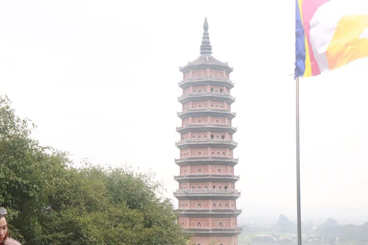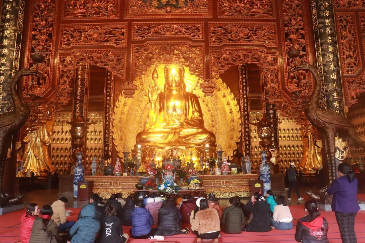Ngoài các lăng điện thờ các vị vua qua các triều đại thì các điện chính của chùa Bái Đính là nơi thời Phật,trong đó nổi bật nhất là Điện Quan Âm. Điện Quan Âm là nơi đặt tượng Quan Thế Âm Bồ Tát nghìn tay nghìn mắt,tượng Phật bà cao gần 10m và được công nhận là Quan Thế Âm Bồ Tát bằng đồng lớn nhất nước ta. Bên cạnh đó,mình còn bị ấn tượng với Điện Tam Thế. Điện Tam Thế nằm ở khá cao,trong điện là nơi đặt ba tượng Tam Thế Phật đại diện cho quá khứ,hiện tại và tương lai: Hoài niệm,trân trọng quá khứ,sống cho hiện tại và cầu mong bình an cho tương lai. Ngày chúng mình ghé chùa Bái Đính,Bảo tháp đang được tu sửa nên không có cơ hội khám phá vẻ đẹp của Bảo tháp nổi tiếng này. Nhìn từ ngoài,sự đồ sợ của 13 tầng Bảo tháp với thiết kế theo phong cách Ấn Độ,xung quang là các bức tường được điêu khắc với những hình tượng Phật mang đến cảm giác an tịnh trong tâm cho du khách ghé thăm. Lên đỉnh một ngọn đồi chùa Bái Đính là tượng Phật Di Lặc – bức tượng lớn nhất Việt Nam,nhìn nụ cười của Phật Di Lặc và cầu chúc vạn sự bình an,hạnh phúc,chắc chắn sẽ mang đến cảm giác yên bình cho du khách.