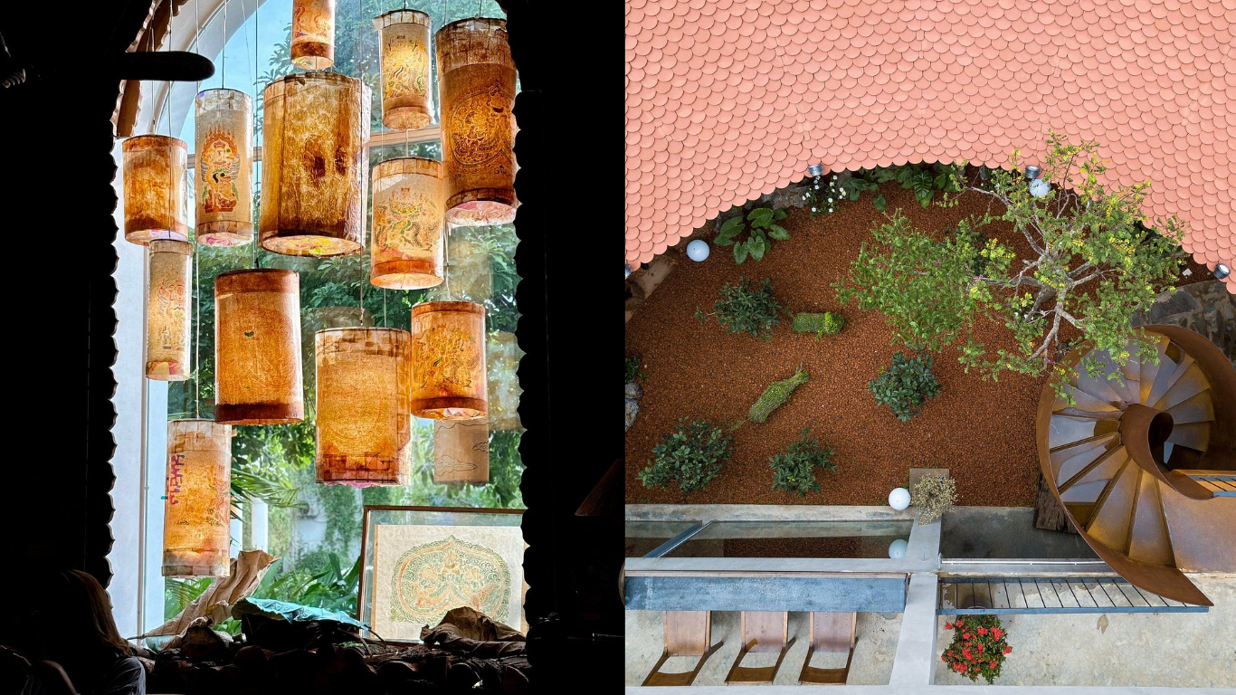 Quán có thiết kế pha lẫn giữa sự cổ điển và hiện đại,mái ngói kiểu truyền thống,cột giả gỗ,cửa vòm mềm mại kết hợp với kính và ánh sáng tự nhiên. Giếng trời là điểm nhấn quan trọng: đặt ở trung tâm quán,nơi đó cây xanh,ánh sáng lọt xuống,mang lại cảm giác thư thái khi ngồi trò chuyện hoặc đọc sách. Trang trí bên trong có tranh,đèn giấy,bàn ghế gỗ – mỗi chi tiết nhỏ được để ý kỹ để tạo nên tổng thể hài hoà. Màu sắc chủ đạo là tông ấm: đỏ đất,gỗ,ánh vàng dịu,giúp tránh cảm giác lạnh lẽo khi thời tiết mát hoặc tối.