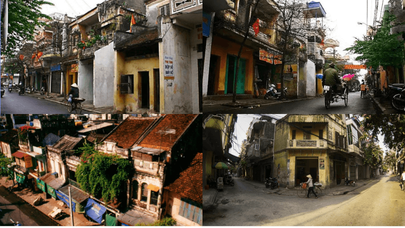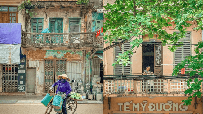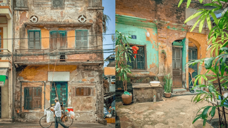 Kiến trúc tại đây mang đặc trưng của lối nhà phố truyền thống Bắc Bộ với những nếp nhà gỗ thấp tầng và mái ngói vẩy cá rêu phong. Tớ đặc biệt ấn tượng với các chi tiết chạm khắc trên cửa võng hay các vì kèo bằng gỗ lim chắc chắn, thể hiện sự tinh xảo trong nghệ thuật xây dựng xưa. Sự kết hợp hài hòa giữa các yếu tố phương Đông và một chút điểm xuyết phong cách Pháp tạo nên diện mạo độc nhất vô nhị cho khu phố.