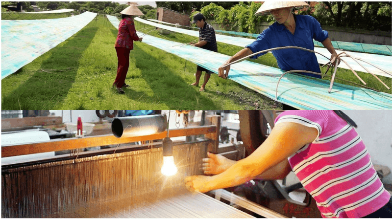 Bước chân vào các xưởng dệt, các cậu sẽ lập tức bị lôi cuốn bởi âm thanh "lạch cách" vui tai của những chiếc khung cửi gỗ đang hoạt động liên tục. Hình ảnh những sợi tơ óng ả đan xen vào nhau dưới ánh nắng xuyên qua kẽ lá tạo nên một khung cảnh lao động vô cùng đẹp mắt. Tớ đã dành hàng giờ đồng hồ chỉ để ngồi quan sát cách những người thợ tỉ mẩn chăm chút cho từng đường tơ kẽ tóc.