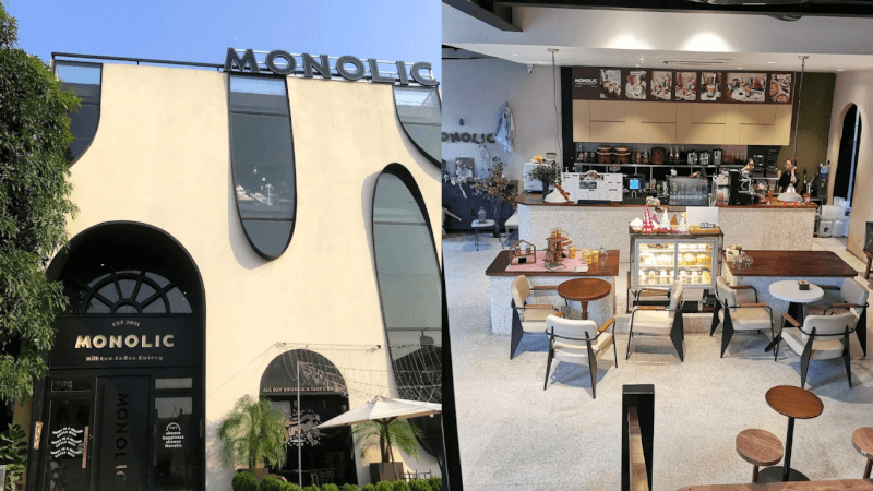 Monolic sở hữu phong cách thiết kế tối giản với những đường nét vuông vức, hiện đại tạo nên một diện mạo vô cùng bắt mắt. Việc sử dụng những tấm kính lớn giúp ánh nắng mặt trời tràn ngập khắp phòng, mang tới cảm giác rộng rãi và thoáng đạt vô cùng. Tông màu xám trắng chủ đạo hòa quyện cùng sắc xanh của cây cối đem lại sự cân bằng tuyệt đối cho thị giác của thực khách.