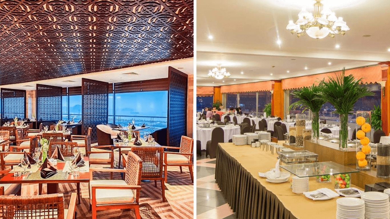 Không gian tại Panorama Hạ Long được thiết kế hiện đại,với sự kết hợp hoàn hảo giữa các yếu tố sang trọng và gần gũi,mang lại cảm giác thư thái cho thực khách. Nhà hàng sử dụng tông màu nhẹ nhàng,kết hợp với ánh sáng tự nhiên từ những cửa sổ lớn,giúp không gian trở nên thoáng đãng và dễ chịu. Các bàn ăn được bố trí khoa học,tạo không gian riêng tư cho từng nhóm khách,đồng thời đảm bảo mọi người đều có thể thưởng thức bữa ăn trong không khí thoải mái nhất.