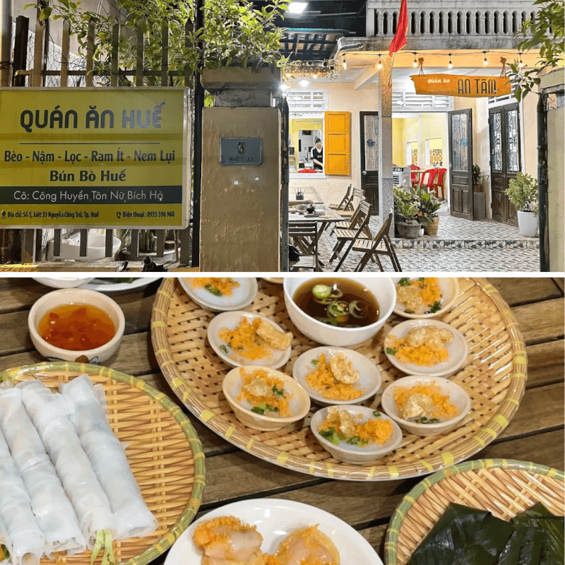 Ẩn mình sâu trong con kiệt nhỏ giữa lòng Huế, Quán ăn An Tâm chào đón mình bằng mùi hương thân thuộc của những bữa cơm nhà nóng hổi. Từng góc nhỏ nơi đây kể cho mình nghe câu chuyện về lòng hiếu khách và những hương vị truyền thống được gìn giữ vẹn nguyên qua năm tháng.