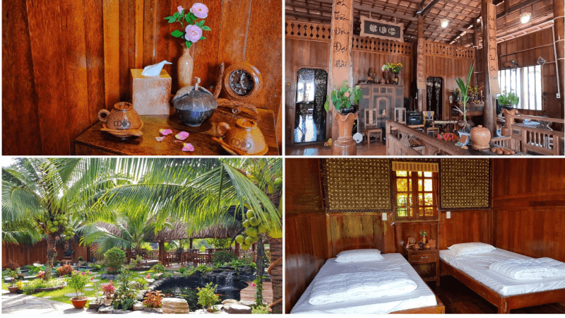 Nội thất bên trong cũng là một thế giới nghệ thuật đầy bất ngờ với sự hiện diện của dừa ở khắp mọi nơi. Bạn sẽ thấy những bộ trường kỷ, tủ thờ hay thậm chí là các bức tranh liễn đối đều được chạm khắc hoặc cẩn gáo dừa vô cùng tinh vi. Sự đồng bộ trong việc sử dụng vật liệu đã tạo nên một không gian sống đậm chất truyền thống nhưng vẫn đầy đủ tiện nghi, mang lại trải nghiệm khác biệt cho du khách.