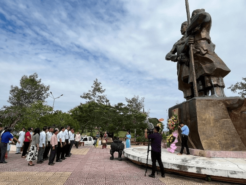 Trong hành trình đó, mình muốn dắt bạn ghé thăm một biểu tượng của lòng quả cảm nằm ngay trung tâm thị trấn. Đó là tượng đài về hai vị anh hùng đã xả thân trong những ngày đầu kháng chiến chống thực dân Pháp xâm lược. Công trình này nằm trong một quần thể văn hóa rộng lớn, tạo nên không gian giáo dục truyền thống đầy ý nghĩa cho các thế hệ sau.