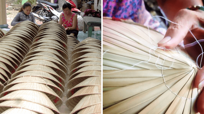 Sau khi chuẩn bị xong nguyên liệu, người thợ bắt đầu xếp lá lên khung gỗ đã có sẵn các vành tre tròn trịa. Công đoạn chằm nón đòi hỏi sự khéo léo tuyệt đối khi người thợ đưa từng mũi kim đều đặn để kết nối các lớp lá lại với nhau một cách chắc chắn. Mỗi đường chỉ cần được thực hiện chặt chẽ giúp chiếc nón có khả năng chịu được mưa nắng và bền bỉ theo thời gian sử dụng.