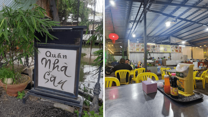 Điểm ấn tượng nhất khiến mình yêu thích nơi này chính là lối kiến trúc nhà sàn gỗ đặc trưng, tái hiện lại nét đẹp truyền thống của vùng đồng bằng. Những bộ bàn ghế đơn sơ được sắp xếp khéo léo dưới mái lá mát rượi, tạo nên một bối cảnh thưởng thức ẩm thực vừa dân dã vừa ấm cúng. Bạn sẽ được ngồi trong một không gian mở, nơi những làn gió tự nhiên từ vườn cây xung quanh thổi vào mang theo hương vị thanh khiết của đất trời.