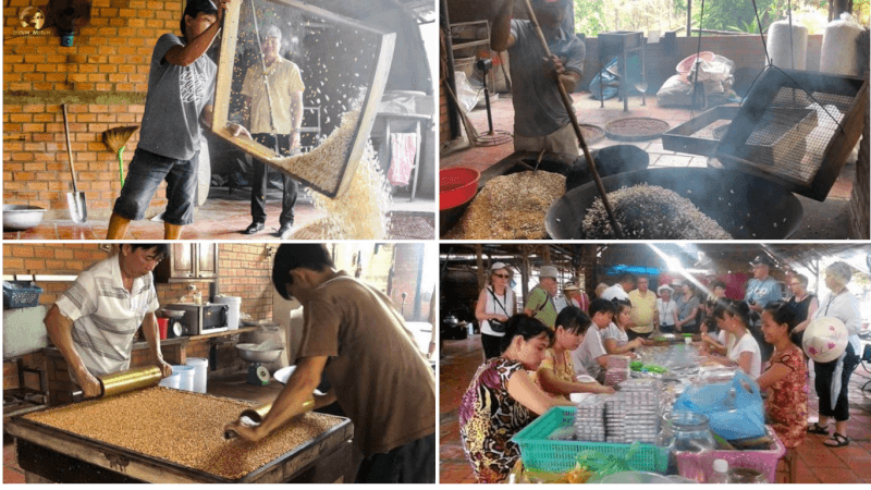 Hoạt động làm cốm nổ tại cơ sở này luôn thu hút sự tò mò và phấn khích của rất nhiều du khách phương xa. Những hạt nếp được rang trong chảo cát nóng cho đến khi nổ bung trắng xóa với những tiếng động lách tách rất vui tai. Người thợ sau đó sẽ khéo léo sàng lọc lớp vỏ, trộn cùng nước đường thơm phức rồi bắt đầu công đoạn cán mỏng.