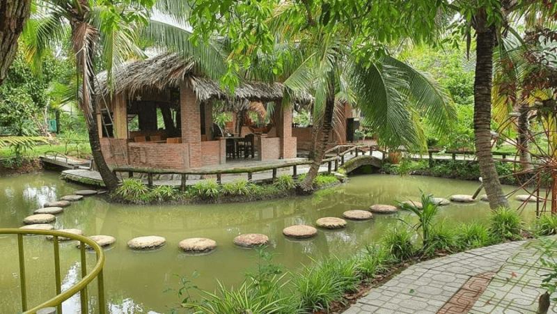 Không gian tại đây được thiết kế hoàn toàn theo phong cách nhà vườn Nam Bộ với những nguyên liệu tự nhiên. Mình rất ấn tượng với cách họ sử dụng gỗ và tre nứa để tạo nên những căn phòng nghỉ ấm cúng, gần gũi. Mọi góc nhỏ đều được chăm chút tỉ mỉ nhằm đem lại cảm giác thoải mái nhất cho bạn khi lưu trú.