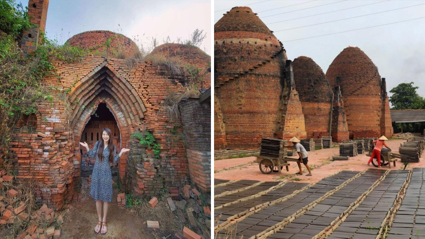 Điểm nhấn đặc biệt nhất khiến nơi này trở nên "hot" rần rần chính là kiến trúc độc đáo của những lò nung gạch khổng lồ. Những khối gạch xếp chồng lên nhau tạo thành những mái vòm cao vút,trông xa như những cây nấm khổng lồ mọc lên từ lòng đất. Màu đỏ au của gạch nung qua năm tháng đã chuyển sang sắc trầm,pha lẫn với màu xanh của rêu và cỏ dại mọc xung quanh. Bối cảnh này tạo ra hiệu ứng thị giác cực mạnh,giúp mọi bức ảnh chụp tại đây đều trở nên có chiều sâu và đậm chất điện ảnh.