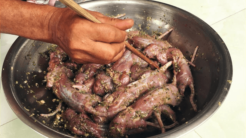 Thịt chuột đồng sau khi được làm sạch sẽ lộ ra lớp thịt màu trắng hồng vô cùng hấp dẫn và hoàn toàn không có mùi lạ. Bạn có thể thưởng thức món chuột xào lăn với vị đậm đà của gia vị, ăn cùng bánh tráng giòn tan và rau sống xanh mướt. Đây là món ăn thường xuất hiện trong các bữa cơm gia đình ấm cúng hoặc những buổi họp mặt bạn bè bên chén rượu nồng.