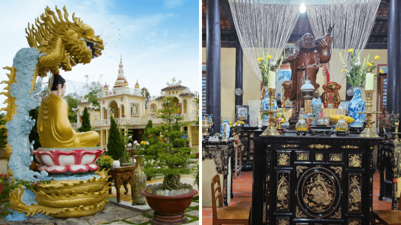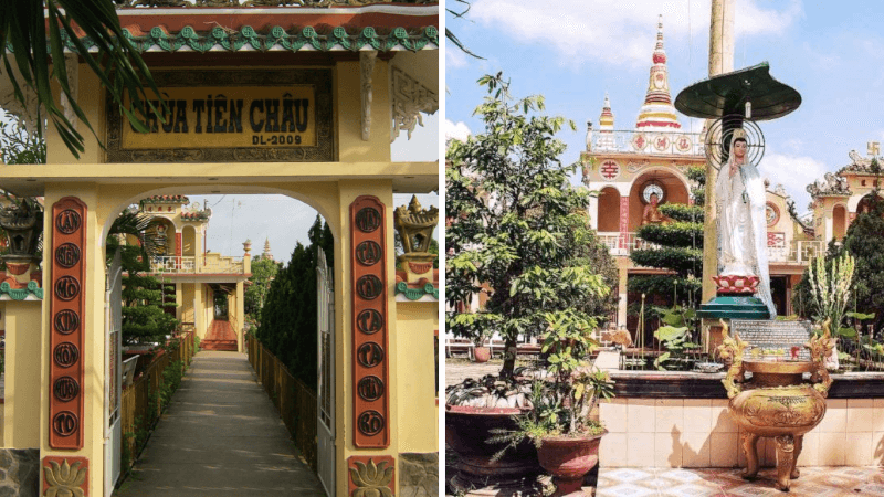 Khi bước vào khuôn viên chùa Tiên Châu, mình sẽ dễ dàng nhìn thấy ba pho tượng Phật lớn được bài trí hài hòa. Ngay trước sảnh là tượng Phật Bà Quan Âm uy nghi đứng trên đài sen, tay Ngài cầm bình nước cam lộ ban phước lành cho chúng sinh. Phía bên trái là tượng Phật Thích Ca Mâu Ni đang tịnh tọa dưới gốc bồ đề, được che chở bởi chín con rồng, mang lại cảm giác bình an, tĩnh tại.