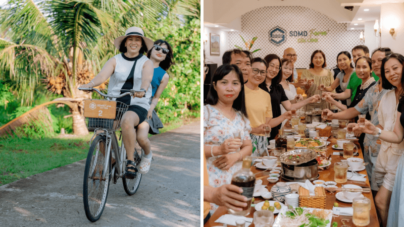 Khi ghé thăm Somo Farm, bạn có cơ hội hóa thân thành người nông dân thực thụ qua các hoạt động như bơi xuồng hay tát mương bắt cá. Cảm giác được len lỏi qua những con rạch rợp bóng dừa nước giúp chúng ta xua tan mọi áp lực của cuộc sống đô thị ồn ào. Sau những giờ vui chơi hết mình, việc tự tay hái mớ rau đồng để chuẩn bị cho bữa tối sẽ mang lại niềm vui giản đơn nhưng đầy ý nghĩa.