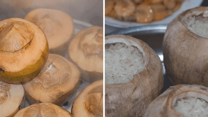 Thay vì dùng nước lọc thông thường, người dân nơi đây sử dụng chính nước dừa tươi để nấu chín những hạt gạo trắng ngần. Quá trình canh nước đòi hỏi kinh nghiệm dày dặn để cơm không bị quá khô hay quá nhão sau khi hoàn thành. Trái dừa đóng vai trò như một chiếc nồi tự nhiên, giúp giữ lại toàn bộ tinh túy và mùi thơm đặc trưng cho phần cơm bên trong.