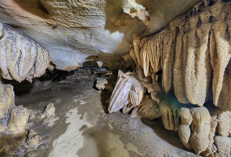 位于洞穴系统深处大象山和松天洞因钟乳石在灯光下闪闪发光如钻石而闻名。洞穴结构复杂,有许多小壁龛,每个开口都开辟了不同的空间,空气始终保持在自然凉爽的水平。 “松天”之名源于钟乳石的形状,就像两个仙女站着聊天,营造出一幅极其生动的自然画面。这是热衷于探索洞穴和寻找高度艺术摄影角度的游客最喜欢的地方。