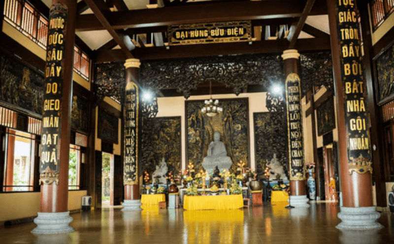 作为寺院建筑群的灵魂和最庞大的建筑,大雄宝殿雄伟地位于山顶,高17m,建筑面积较大,足以同时容纳数百名佛教徒。大雄宝殿的建筑风格具有陈朝风格,坚固的铁木柱体系,弧形龙鳞瓦屋顶,精美的佛像浮雕。踏入其中,游客会感受到绝对的寂静,淡淡的香火与巨型砂岩佛像散发出的柔和光芒融为一体,带来一种奇异的平静与尊严的感觉。