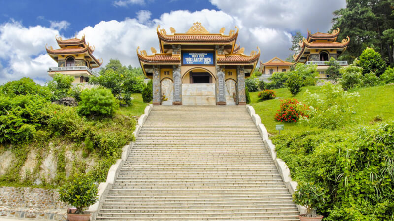 雄伟地坐落在富寿省三岛公社三岛山脉的高山山坡上,竹林西天禅寺不仅是越南三大禅寺之一,也是竹林禅宗的光辉象征。陈仁宗佛祖。苍茫青山密林之中,寺院犹如一朵浮云中的巨型莲花,汇聚了天地灵气和祖地千代精神文化的精髓。传统建筑与雄伟的自然风光融为一体,这里给游客一种绝对宁静的感觉,完全远离城市生活的喧嚣,让我们回归最初的价值观和心灵深处的平静。