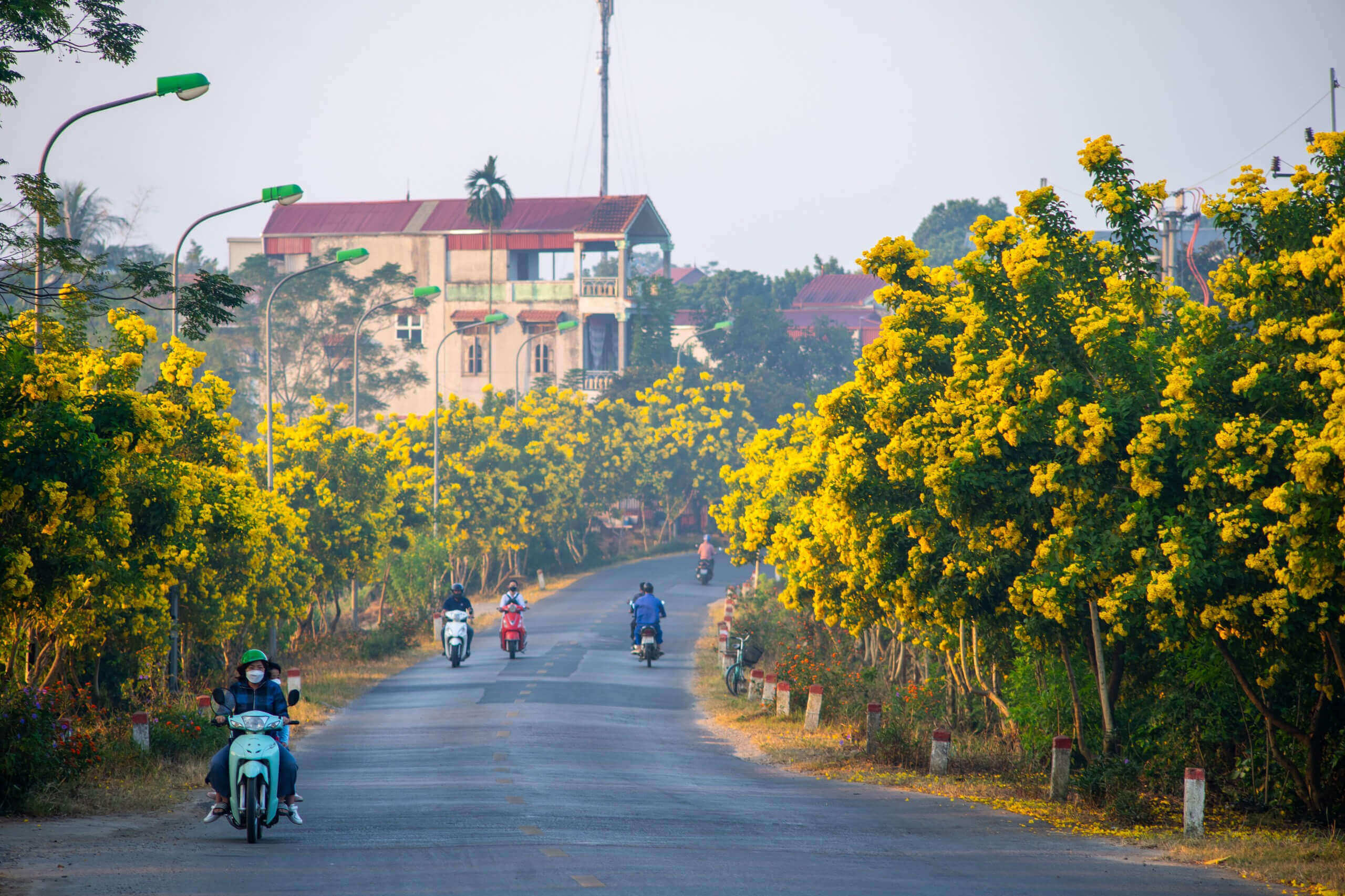 黄色い鐘の花は、米国南部地域が原産で、ピーマンの花などさまざまな名前でも知られています。花が咲くたびに、この木は葉をすべて落として、鮮やかな花房を露出させることがよくあります。ミンロンさんによると、このフラワーロードは2020年に植えられ、2022年から現在まで咲き始めているとのこと。花木の世話は、地域の村やコミューンの女性協会と軍隊によって行われています。