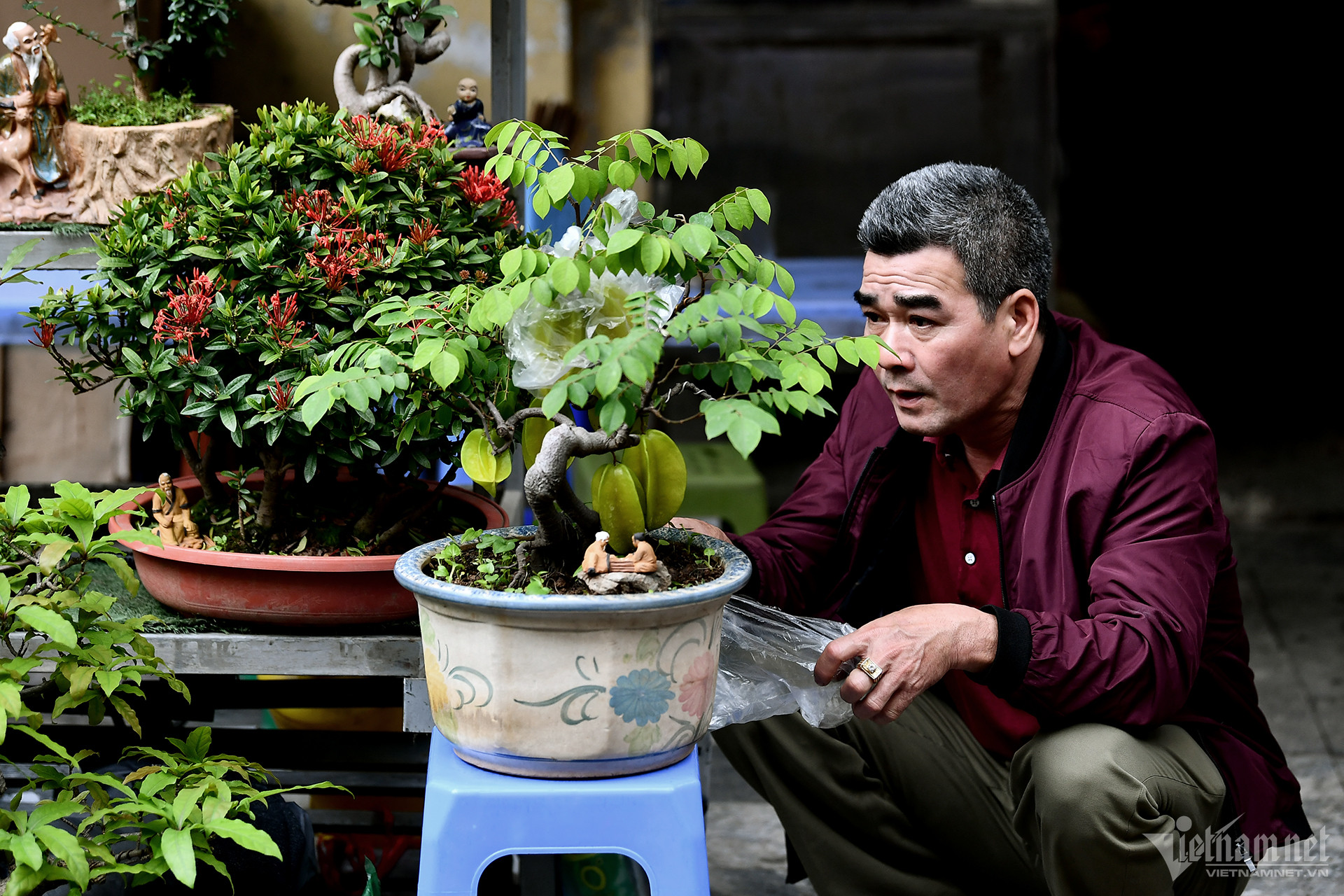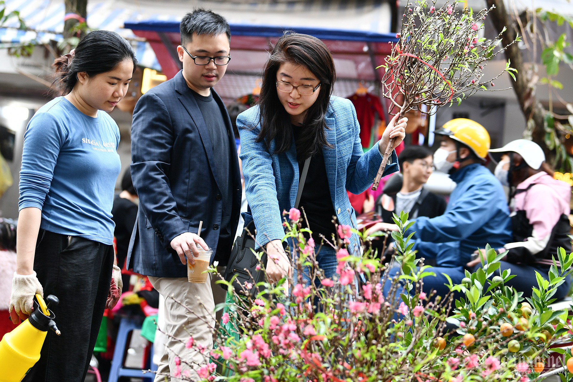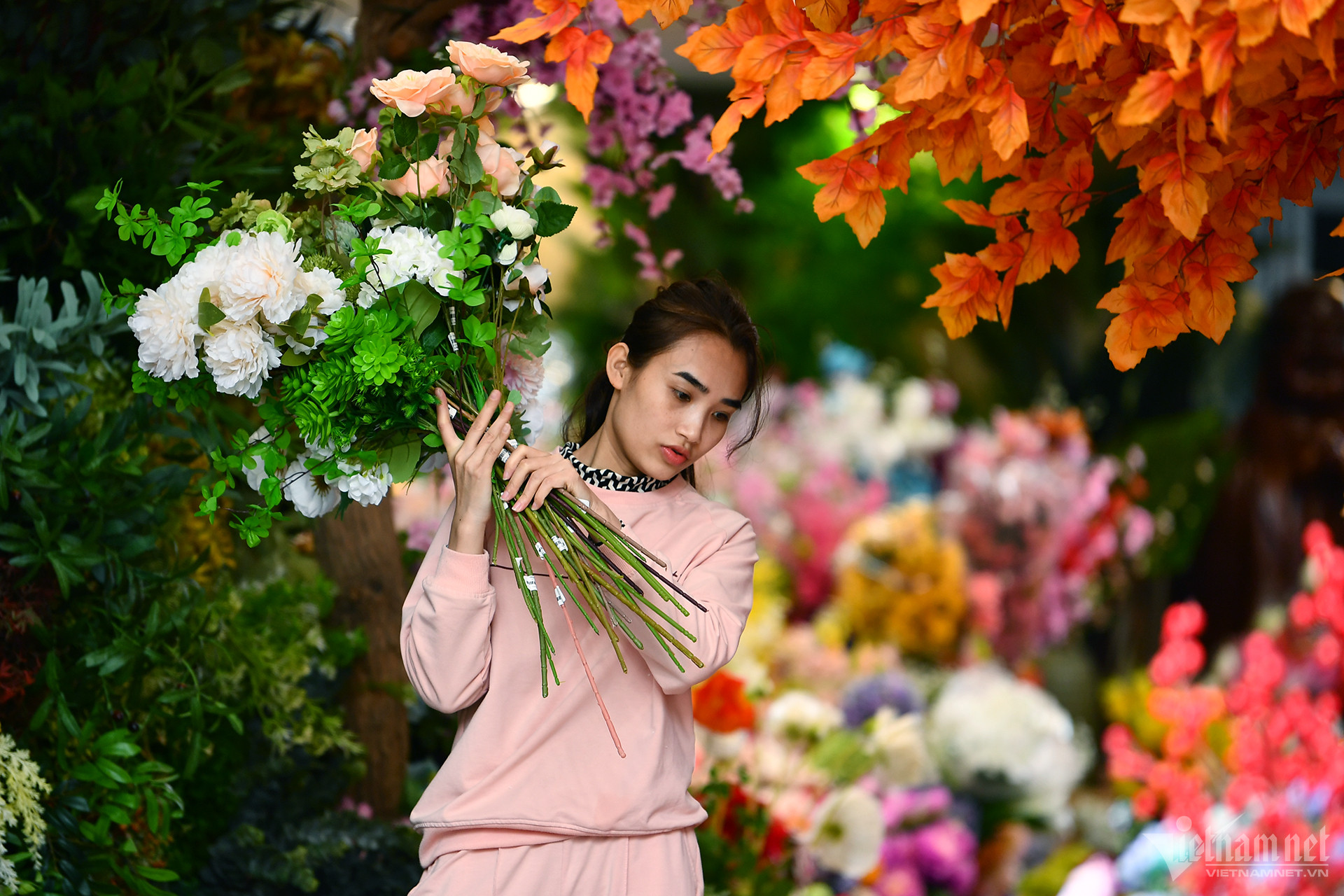 ハンルオック市場には、桃、アプリコット、金柑の花だけでなく、あらゆる形や大きさのシルクフラワーや造花を販売する店がたくさんあります。今日の売り手たちは花かごの掃除と飾りつけで大忙しでした。